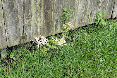 Also, while mowing grass this morning, I saw the first spider lilies. Several years ago I found some white ones, and transplanted them along the fence line.